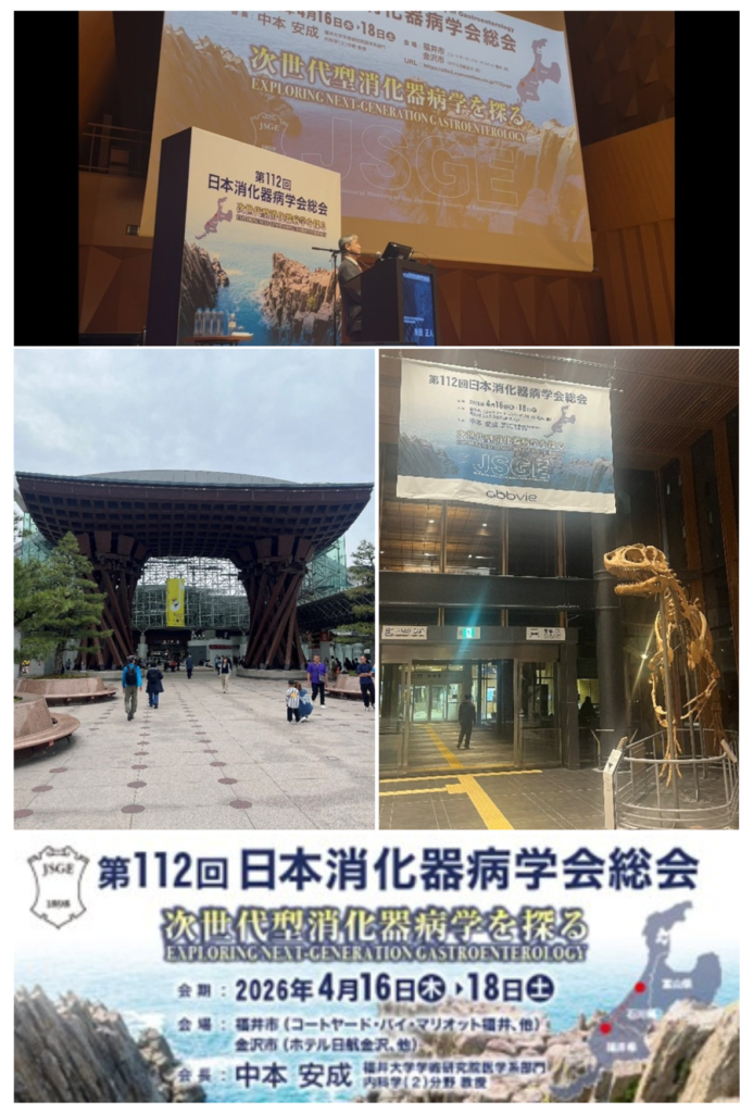 2026年4月16日(木)~4月18日(土)にかけて、福井市および金沢市において第112回日本消化器病学会総会が行われました。当法人からも以下のごとく、多数の演題発表を行い、活発な議論が交わされ、大変有意義な経験となりました。